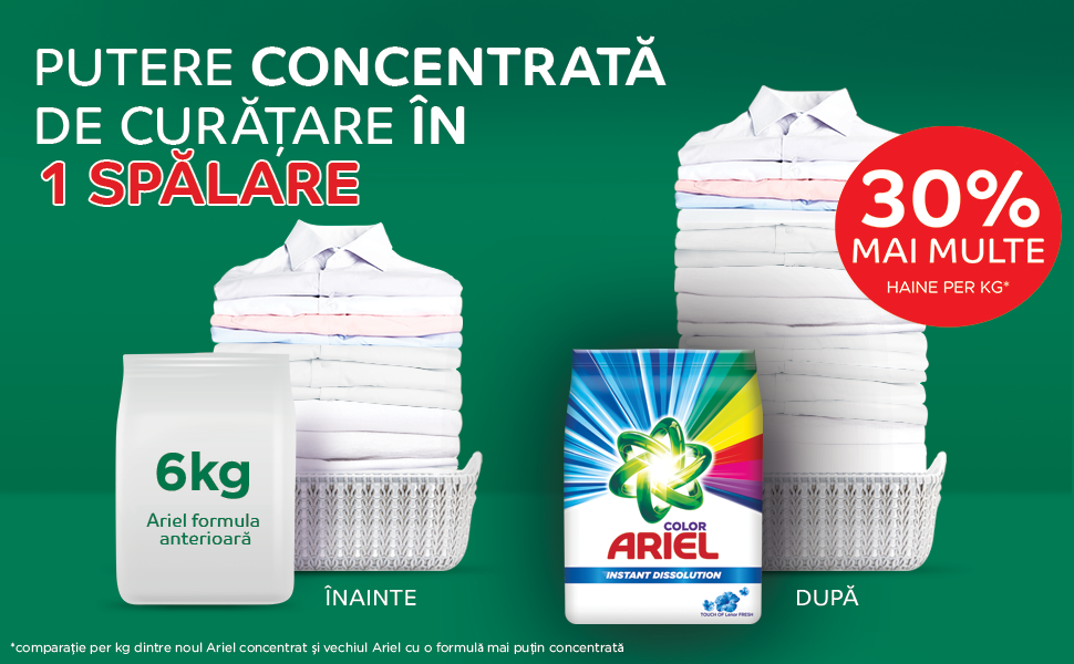 Acum, cu formula sa concentrata, Ariel ofera o putere de curatare mai mare si spala mai multe rufe per kilogram. |